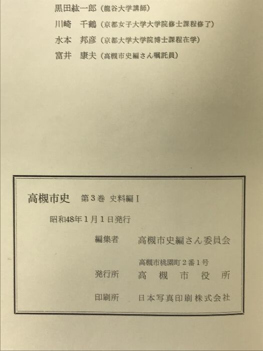 タイトル:高槻市史(第3巻)史料編1 大阪府 昭和48年 発行:高槻市役所