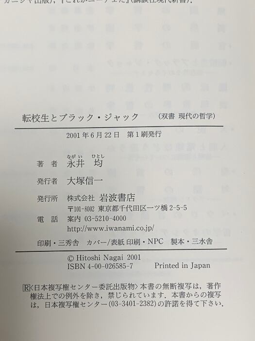 タイトル:転校生とブラック・ジャック―独在性をめぐるセミナー (双書・現代の哲学) 岩波書店 永井 均