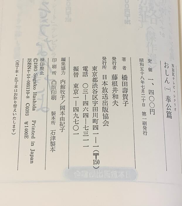 初版 おしん 全4巻 セット NHK テレビ・シナリオ 日本放送出版協会 橋田壽賀子 奉公篇 結婚篇 流浪篇 戦後篇