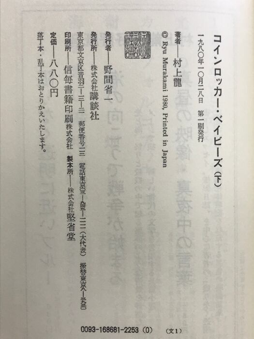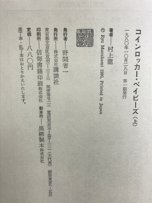 タイトル:【初版】(上・下巻/全2冊セット)。コインロッカー・ベイビーズ 講談社 村上龍