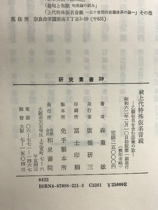 タイトル:上代特殊仮名音義 続 (研究叢書 39) 和泉書院 森 重敏