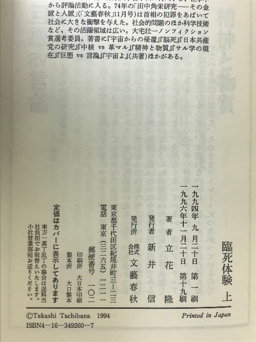 タイトル:臨死体験 上 文藝春秋 立花 隆