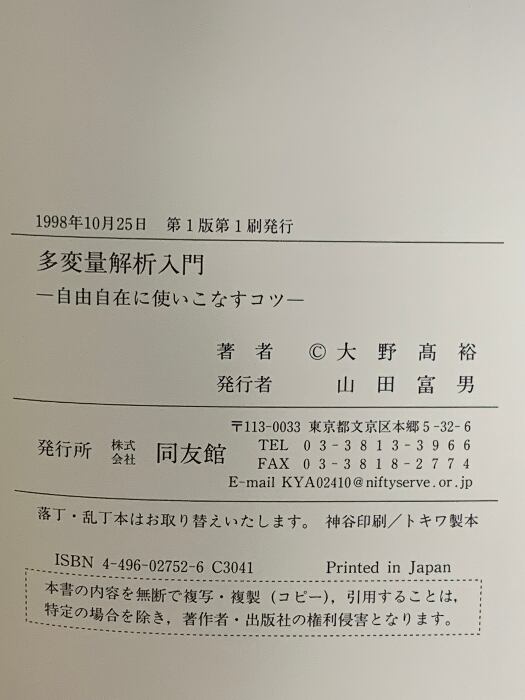 タイトル:多変量解析入門: 自由自在に使いこなすコツ 同友館 大野 高裕