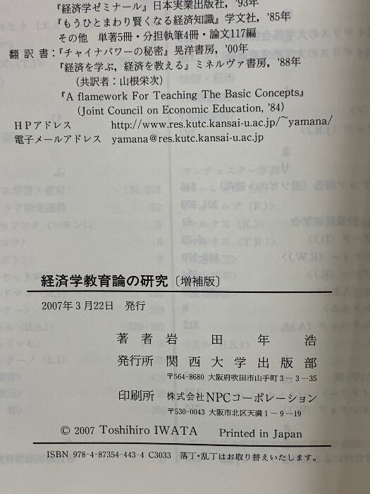 タイトル:経済学教育論の研究 増補版 関西大学出版部 岩田 年浩