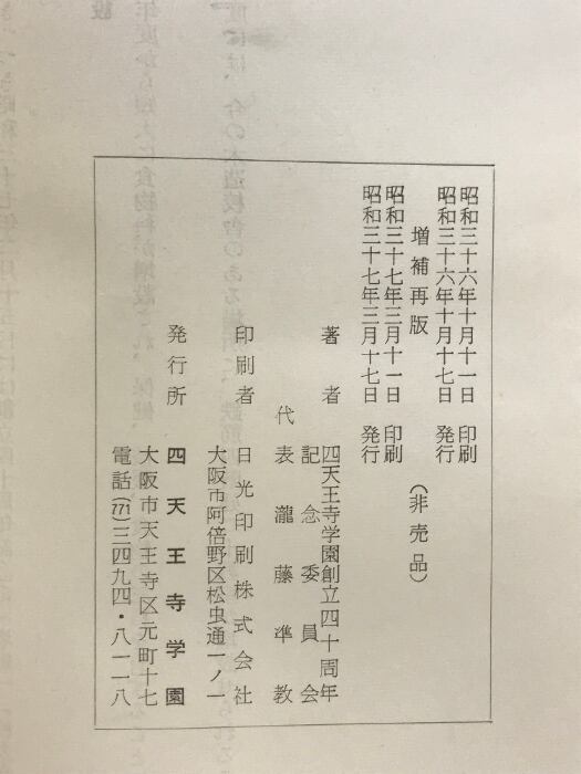 タイトル:四天王寺学園史 (四天王寺学園創立40周年)増補再販 昭和37年 発行:四天王寺学園 四天王寺学園創立40周年記念委員会【非売品】