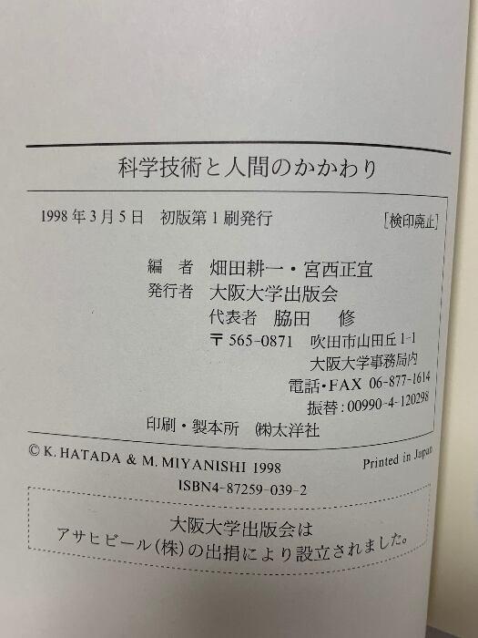 タイトル:科学技術と人間のかかわり 大阪大学出版会 畑田耕一