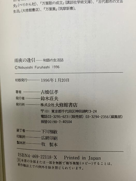 タイトル:雨夜の逢引: 和語の生活誌 大修館書店 古橋 信孝