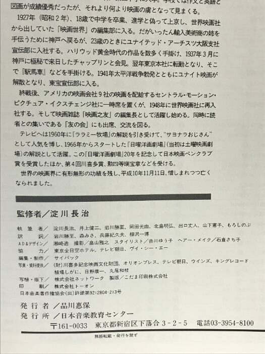 銀幕の夢 淀川長治 映画音楽館 日本音楽教育センター 監修:淀川長治