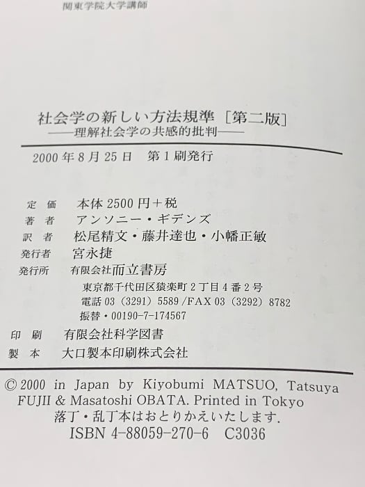 タイトル:社会学の新しい方法規準 第2版: 理解社会学の共感的批判 而立書房 アンソニー ギデンズ