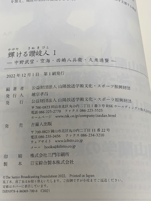 輝ける讃岐人1―中野武営・空海・西嶋八兵衛・久米通賢 吉備人出版 公益財団法人山陽放送学術文化スポーツ振興財団