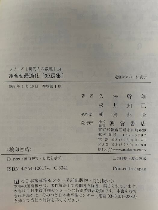 タイトル:組合せ最適化短編集 (シリーズ現代人の数理 14) 朝倉書店 久保 幹雄
