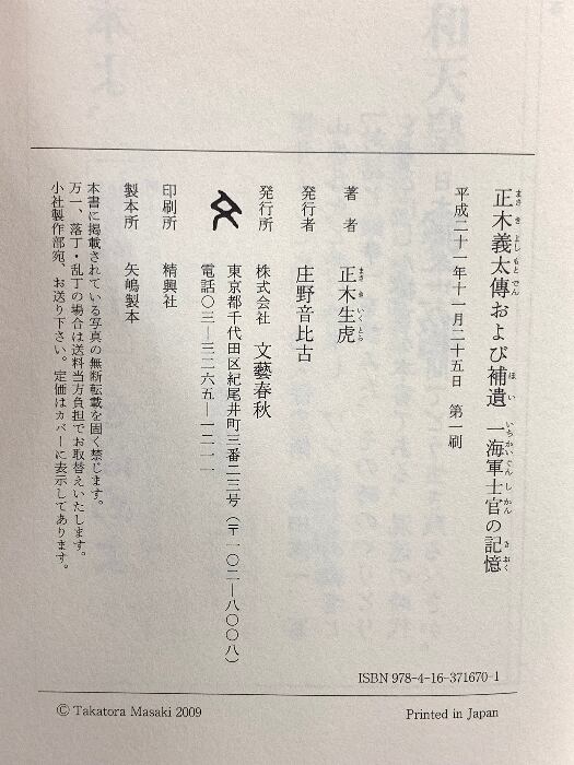 正木義太傳および補遺 一海軍士官の記憶 文藝春秋 正木 生虎