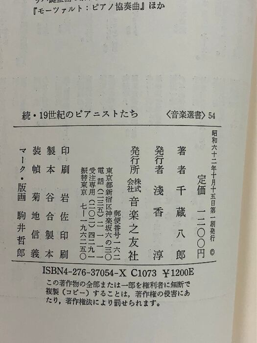 タイトル:続・19世紀のピアニストたち (音楽選書 54) 音楽之友社 千蔵 八郎