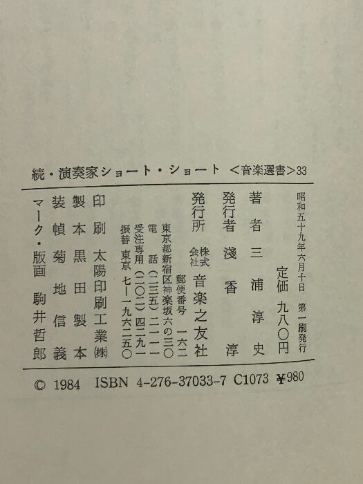 続・演奏家ショ-ト・ショ-ト (音楽選書 33) 音楽之友社 三浦 淳史