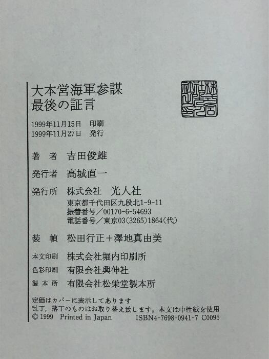 タイトル:大本営海軍参謀最後の証言 潮書房光人新社 吉田 俊雄
