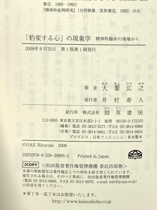 タイトル:「豹変する心」の現象学 精神科臨床の現場から 勁草書房 大饗 広之