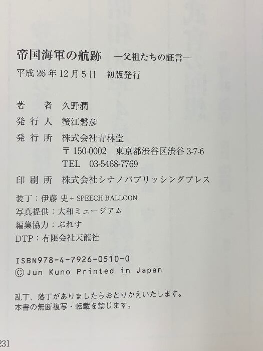 タイトル:サイン本 初版 帝国海軍の航跡 父祖たちの証言 青林堂 久野潤