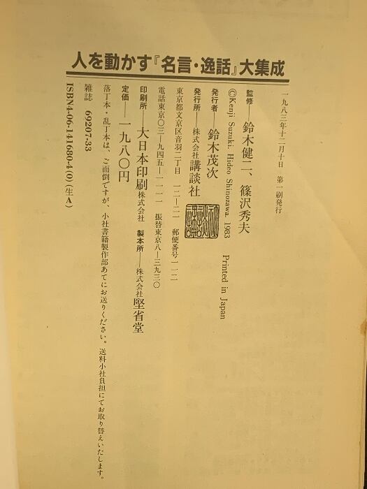 タイトル:人を動かす名言・逸話大集成 (ライフカルチュアシリーズ) 講談社 監修 鈴木健二 篠沢 秀夫