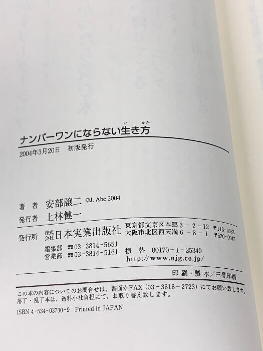 タイトル:ナンバーワンにならない生き方 日本実業出版社 安部 譲二