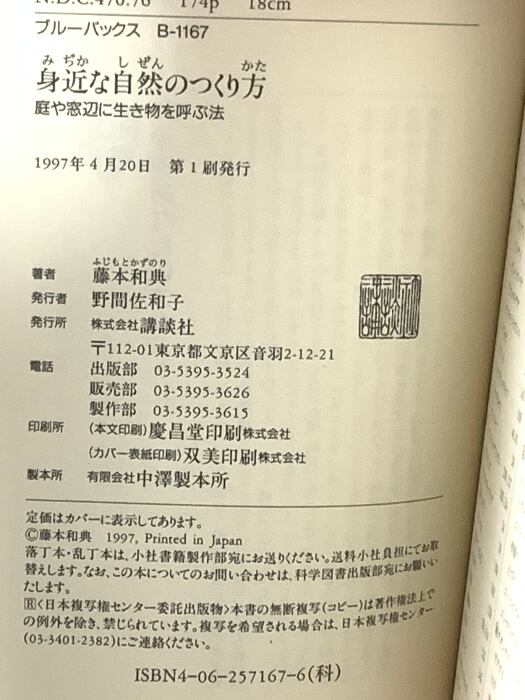 タイトル:身近な自然のつくり方: 庭や窓辺に生き物を呼ぶ法 (ブルーバックス 1167) 講談社 藤本 和典
