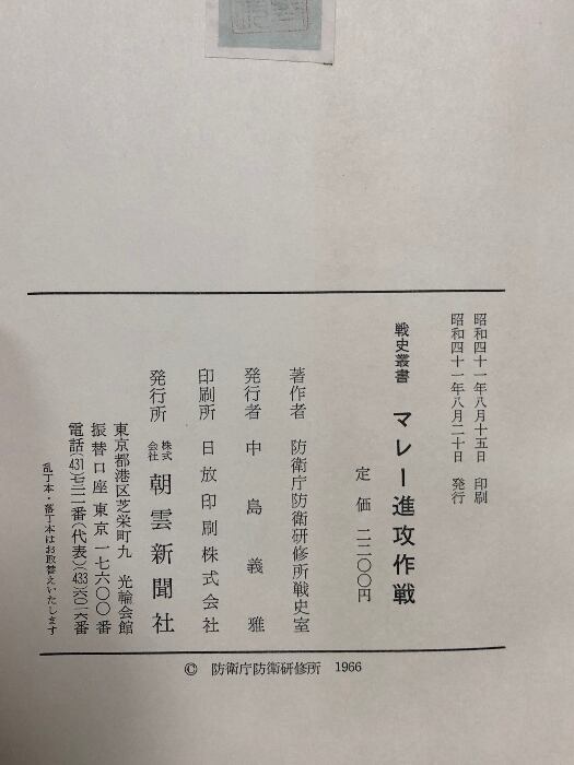 戦史叢書 マレー進功作戦 防衛庁防衛研修所戦史室 付図付き 朝雲新聞社