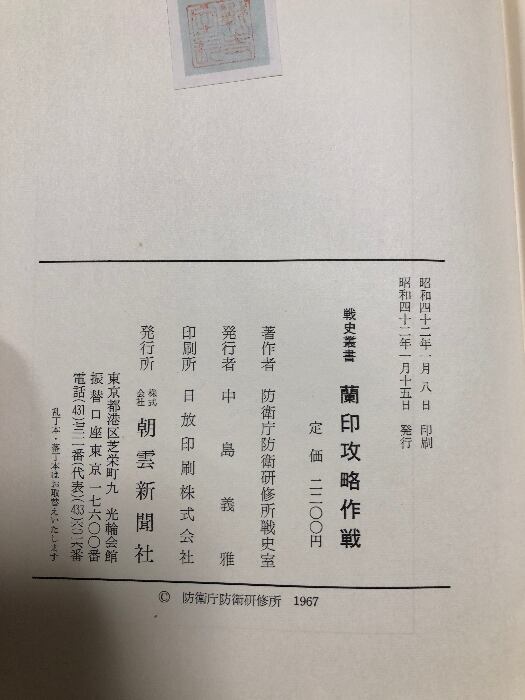 タイトル:戦史叢書 蘭印政略戦争 防衛庁防衛研究所戦史室 付図付き。付録付き。 朝雲新聞社