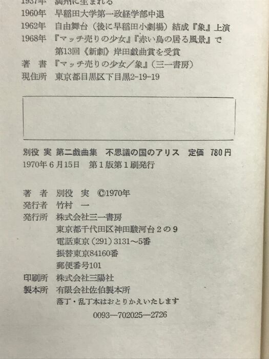 タイトル:不思議の国のアリス―別役実第二戯曲集 三一書房 別役実