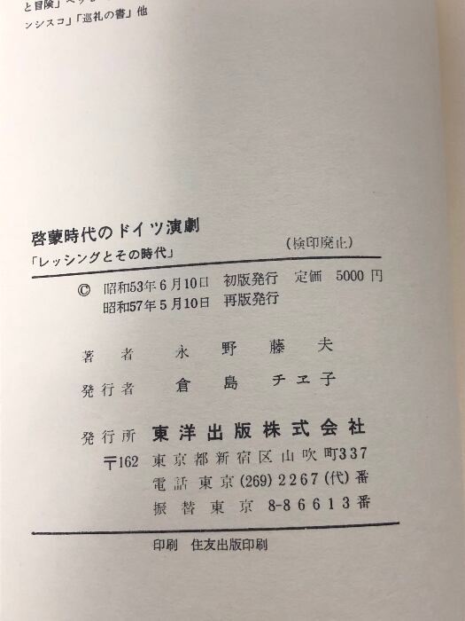 啓蒙時代のドイツ演劇―レッシングとその時代 (1978年) 永野藤夫 東洋出版