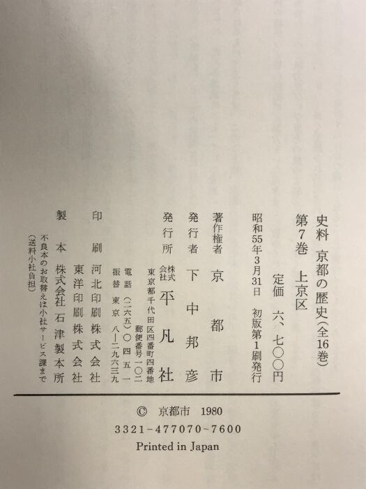 タイトル:史料 京都の歴史(7)上京区 平凡社 昭和55年 発行:京都市
