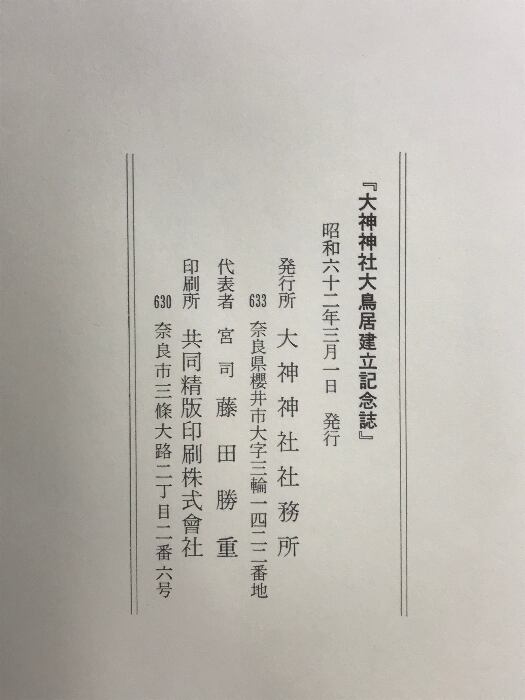 タイトル:大神神社 大鳥居建立記念誌 昭和62年 発行:大神神社社務所