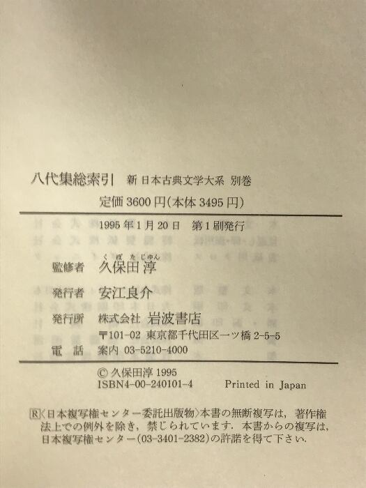 タイトル:八代集総索引 新日本古典文学大系 (別巻) 岩波書店 久保田 淳