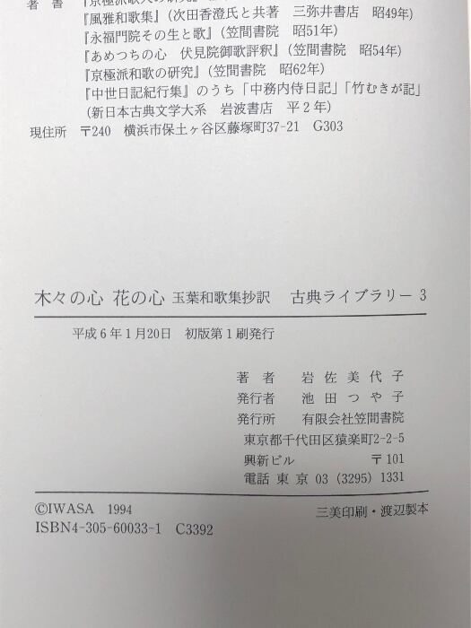 タイトル:木々の心花の心: 玉葉和歌集抄訳 (古典ライブラリー 3) 笠間書院 岩佐 美代子