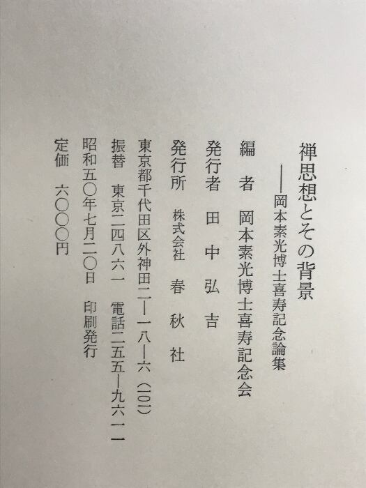 タイトル:禅思想とその背景 (岡本素光博士喜寿記念論集)発行所:春秋社 発行者:田中弘吉 編者:岡本素光博士喜寿記念会 昭和50年