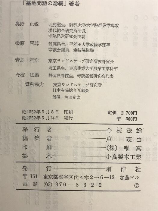 墓地問題の総編 発行者:今枝法雄 編:東茂由 発行:創作社 昭和52年