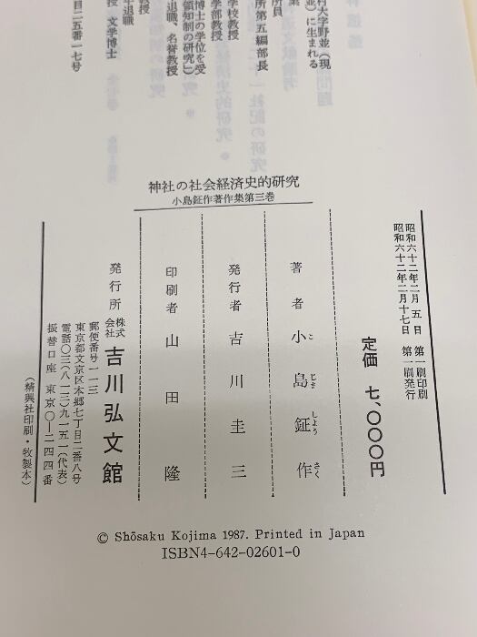 タイトル:小島鉦作著作集 第3巻 神社の社曾経済史的研究 吉川弘文館 小島 鉦作