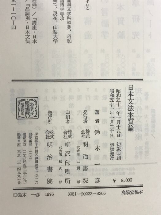 タイトル:日本文法本質論 発行:明治書院 著:鈴木一彦 昭和51年