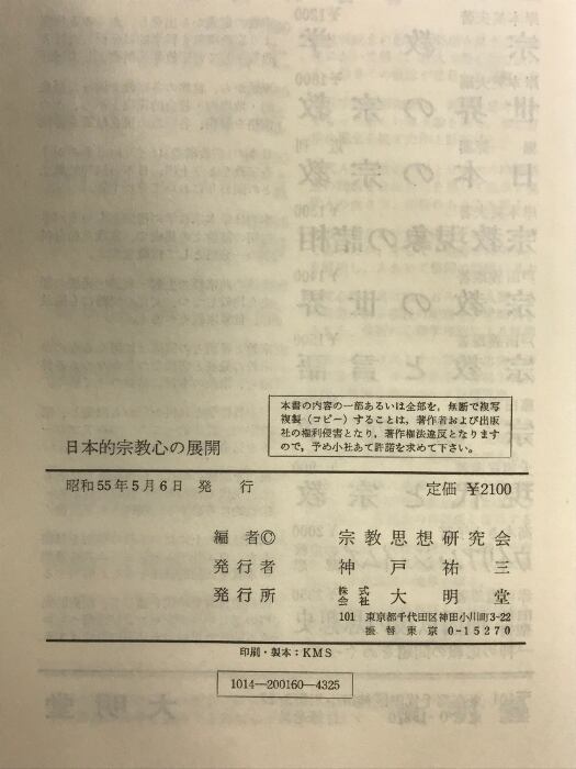 日本的宗教心の展開(宗教思想研究会編)発行:大明堂 発行者:神戸祐三 編:宗教思想研究会 昭和55年
