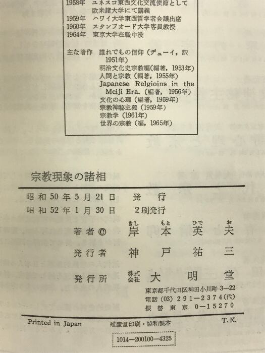 タイトル:宗教現象の諸相 発行:大明堂 著:岸本英夫 昭和52年