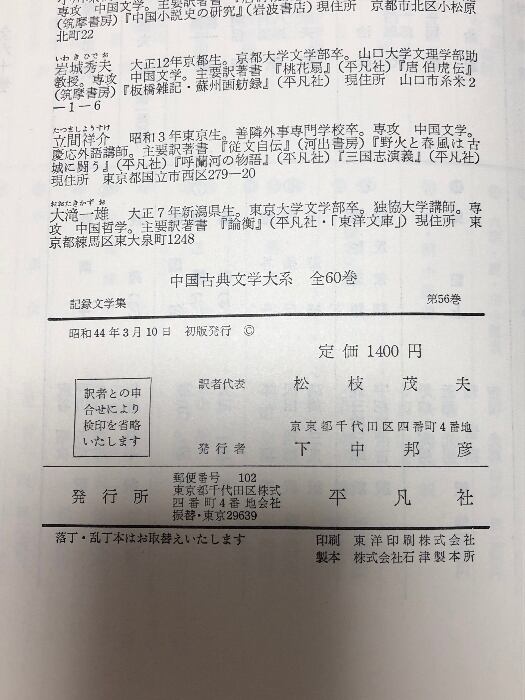 タイトル:中国古典文学大系〈56巻〉記録文学集 松枝茂夫 平凡社