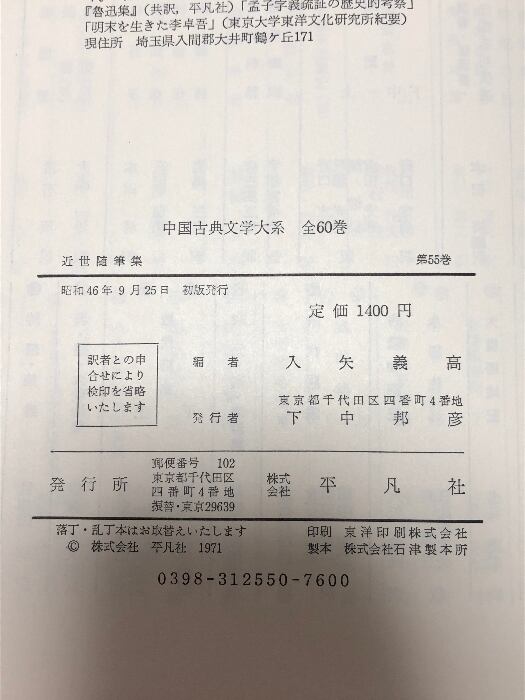 タイトル:中国古典文学大系 55 平凡社 入矢 義高
