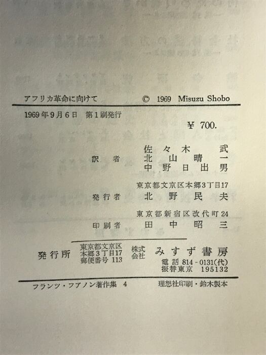 タイトル:フランツ・ファノン著作集〈第4〉アフリカ革命に向けて みすず書房 佐々木武 他:訳