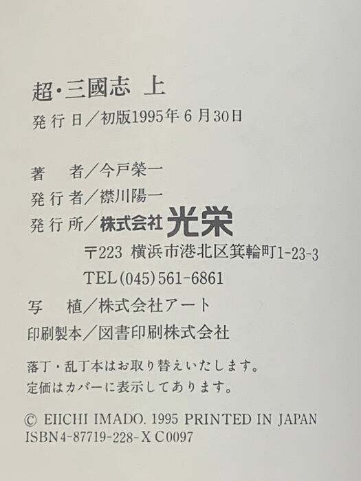 タイトル:超・三國志 反三国志演義より 上中下 全3巻 セット 光栄ノベルズ KOEI 今戸 榮一