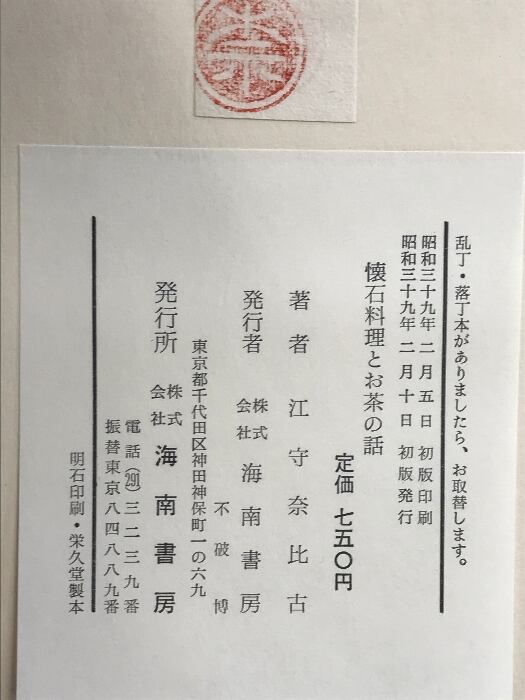 懐石料理とお茶の話―八百善主人ものがたり 海南書房 江守奈比古