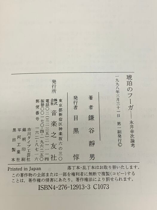 タイトル:琥珀のフーガ―永井幸次論考 音楽之友社 鎌谷 静男
