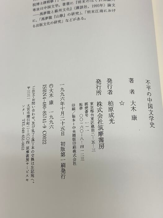 タイトル:不平の中国文学史 筑摩書房 大木 康