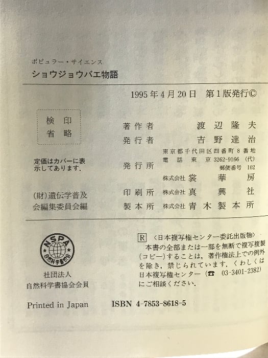 タイトル:ショウジョウバエ物語 (ポピュラー・サイエンス) 裳華房 渡辺 隆夫