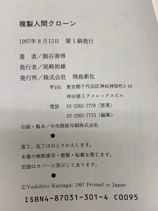 複製人間クロ-ン: 「クロ-ン人間」の研究最前線!! 飛鳥新社 熊谷 善博