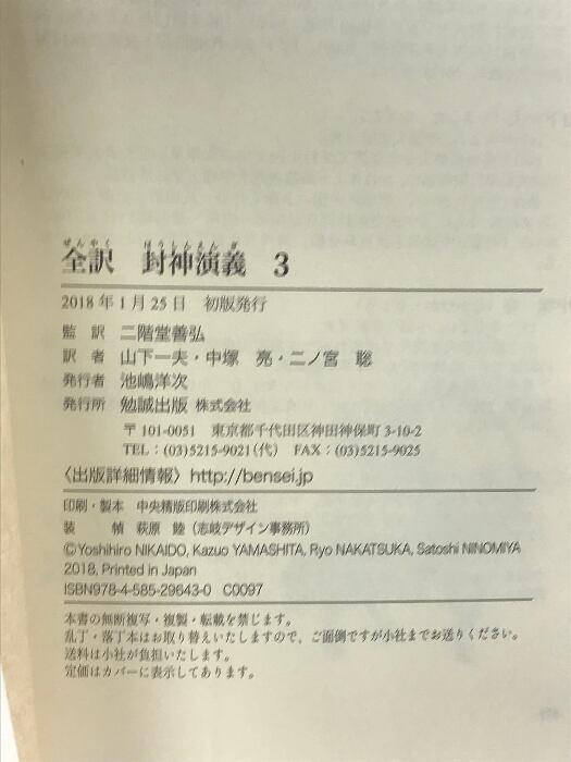タイトル:全訳 封神演義 (3) 勉誠出版 二階堂善弘