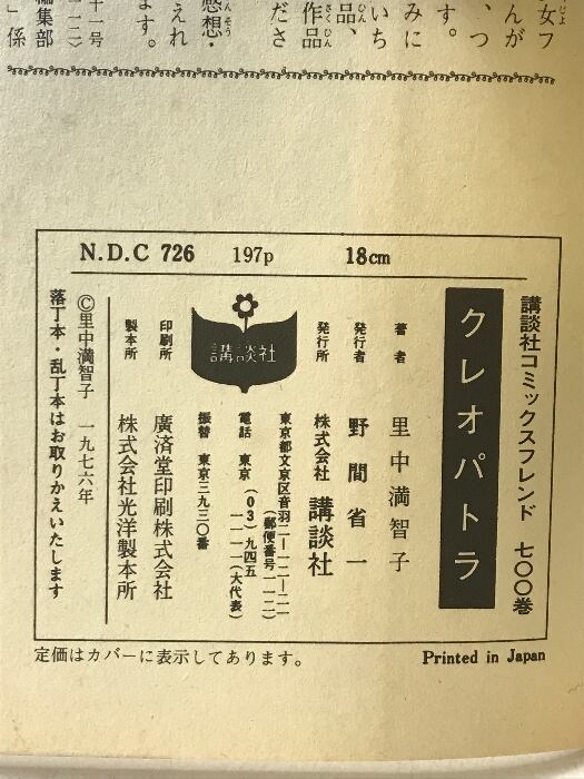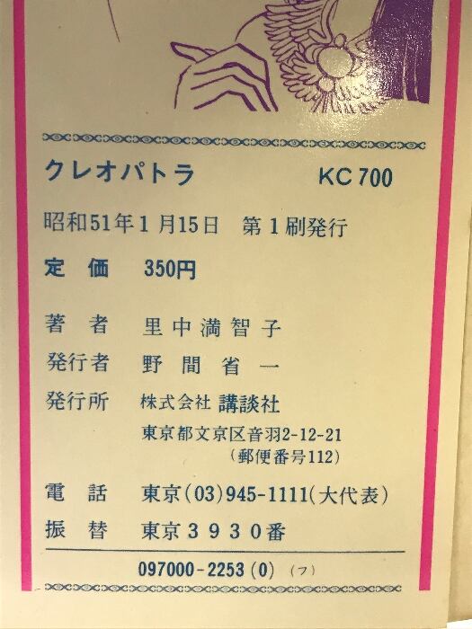 タイトル:クレオパトラ 講談社コミックスKC 講談社 里中満智子 昭和51年