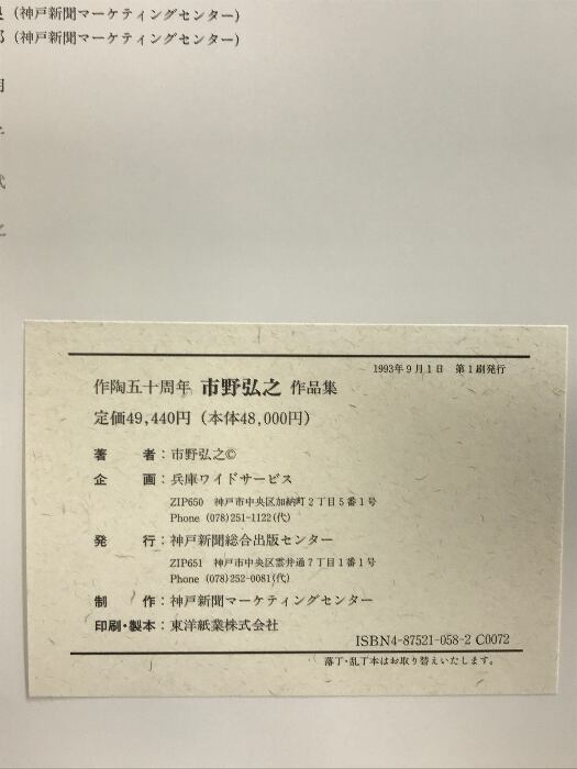 タイトル:【図録】陶 (作陶50周年)市野弘之作品集 発行:神戸新聞総合出版センター 著:市野弘之 1993年